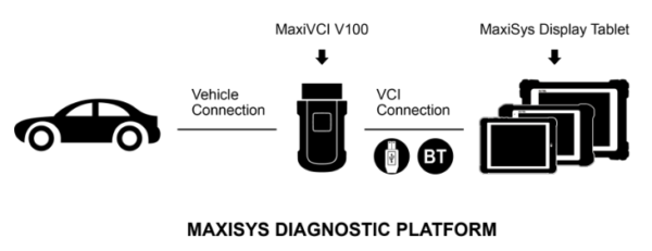 The MaxiSys diagnostic platform combines the MaxiVCI V100 and the display tablet with technical information into a single program, ensuring quick and simple access to the vehicle to perform comprehensive diagnostics applications