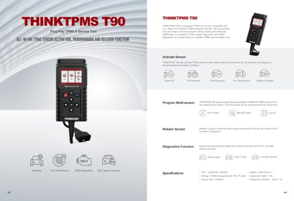THINKTPMS T90is a plug-play TPMS service tool, compatible with U.S, Asian and European TPMS-equipped vehicles. T90 can activate, read and relearn all known sensors without binding with thinktools